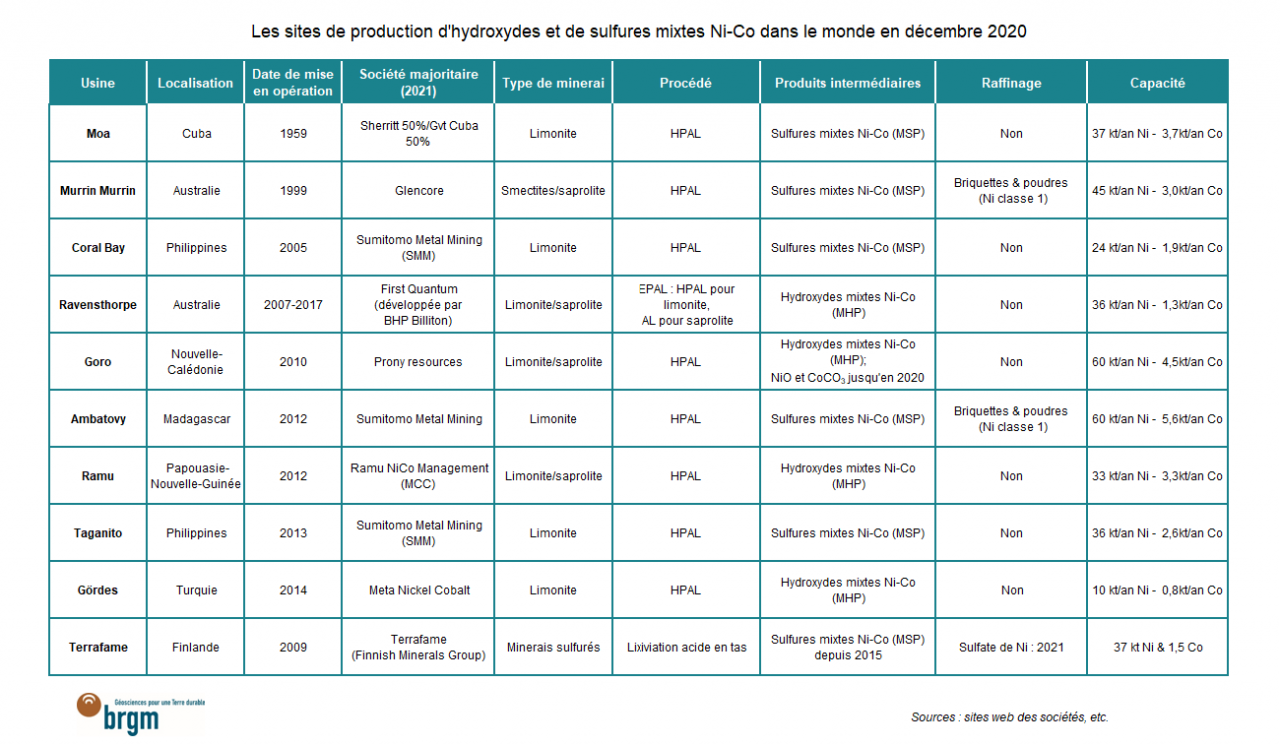 Les hydroxydes (MHP/NHC) et sulfures mixtes de nickel-cobalt (MSP) sont, à une exception près, tous issus du traitement de minerais nickélifères latéritiques par un procédé hydrométallurgique de lixiviation acide sous pression HPAL/EPAL (« High Pressure Acid Leaching/Enhanced Pressure Acid Leaching »). Sur les 11 usines mises en production dans le monde depuis 60 ans, 9 demeurent aujourd’hui en activité dont la plus ancienne à Moa Bay (Cuba), et sont toutes situées hors-Chine. Le minerai est majoritairement de la limonite à basses teneurs en Ni et Co ou, plus rarement, un mélange limonite/saprolite plus riche en nickel. La lixiviation du minerai dans des autoclaves conduit, selon le procédé utilisé, à la formation d’hydroxydes ou de sulfures mixtes de Ni et Co. Les MSP sont actuellement produits dans cinq usines, Moa Bay à Cuba, Coral Bay et Taganito aux Philippines, Ambatovy à Madagascar et Murrin Murrin en Australie. Les MHP sont produits sur quatre sites : Ravensthorpe4 en Australie, Ramu en Papouasie-Nouvelle-Guinée et Gördes en Turquie. L’usine de Goro en Nouvelle-Calédonie, qui avait été arrêtée en urgence en décembre dernier, devrait redémarrer la production d’hydroxyde – aussi appelé NHC (« Nickel Hydroxyde cake ») en 2021. L’usine HPAL a cessé de produire de l’oxyde de nickel (NiO) et du carbonate de cobalt (CoCO3) courant 2020 pour se concentrer sur la production de MHP (18 kt). L’acquisition des actifs néo-calédoniens de Vale par le consortium Prony Resources5 a été actée le 31 mars 2021, ouvrant ainsi la voie à une reprise imminente de l’activité.