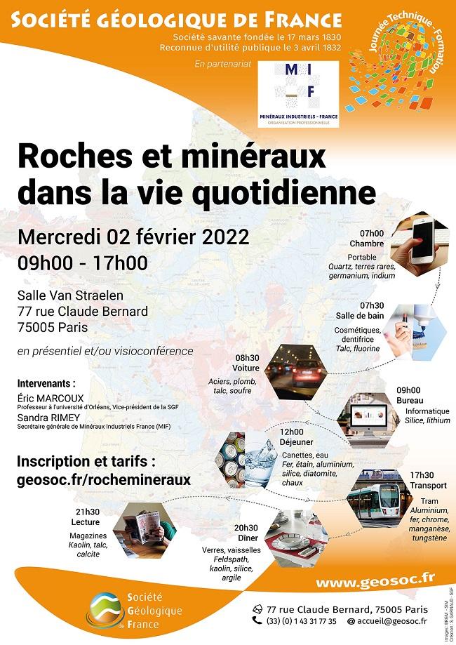 La Société Géologique de France (SGF), en partenariat avec l'organisation professionnelle Minéraux Industriels - France (MI France) vous invite à la journée technique intitulée "roches et minéraux dans la vie quotidienne".