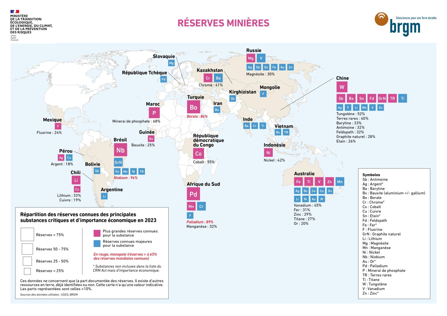 Les réserves minières représentées sont basées principalement sur les données de l’USGS. Les réserves sont définies par des critères de connaissances géologiques, de faisabilité technique et de rentabilité économiques, elles évoluent dans le temps. Ainsi, des réserves connues aujourd’hui ne seront jamais exploitées et à l’inverse, certains pays ne ressortant pas sur cette carte, car ne possédant à priori pas de réserves sur leurs territoires pourraient un jour devenir des producteurs importants. Les réserves de borate, de niobium et de palladium sont chacune très concentrées dans un unique pays que sont respectivement la Turquie, le Brésil et l’Afrique du Sud. De nombreuses réserves connues n’apparaissent pas sur la carte puisque la part de celles-ci dans le total mondial est trop faible pour être représentée.